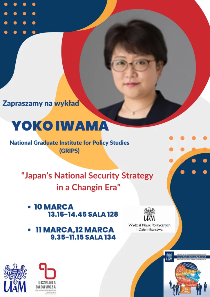 Plakat promujący wykład Yoko Iwamy z National Graduate Institute for Policy Studies (GRIPS) na temat "Japan’s National Security Strategy in a Changing Era", organizowany przez Wydział Nauk Politycznych i Dziennikarstwa Uniwersytetu im. Adama Mickiewicza w Poznaniu. Szczegóły: 10 marca, godz. 13:15-14:45, sala 128; 11 i 12 marca, godz. 9:35-11:15, sala 134.